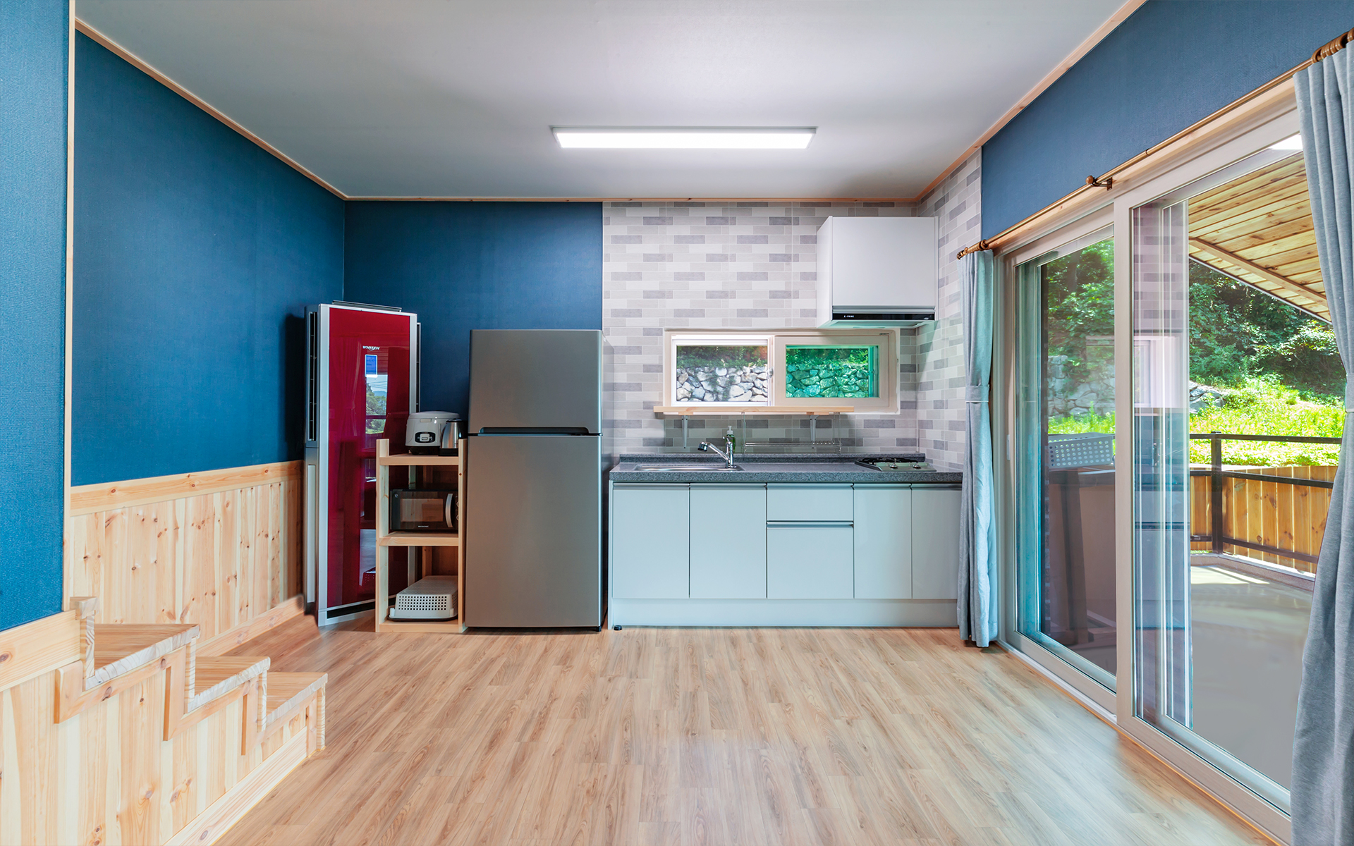 냉장고, 가스렌지, 밥솥, 전자렌지, 커피포트, 식기류일체